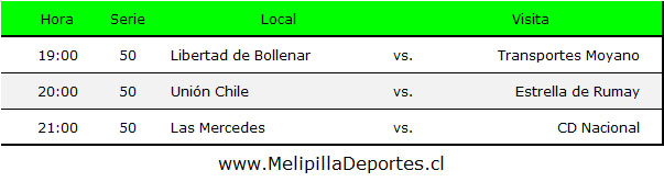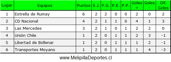 <div class="alert alert-warning"><strong>Resultados 2ª fecha</strong></div> <img class="alignnone wp-image-59594 size-full" src="https://www.melipilladeportes.cl/3.0/wp-content/uploads/2026/02/ad26007.jpg" alt="" width="434" height="296" data-pin-no-hover="true" /> <div class="alert alert-warning"><strong>Tablas de posiciones</strong></div> <img class="alignnone wp-image-59595 size-full" src="https://www.melipilladeportes.cl/3.0/wp-content/uploads/2026/02/ad26008.jpg" alt="" width="571" height="209" data-pin-no-hover="true" /> <div class="alert alert-warning"><strong>Programación 3ª fecha, sábado 21 de febrero de 2026</strong></div> <img class="alignnone wp-image-59596 size-full" src="https://www.melipilladeportes.cl/3.0/wp-content/uploads/2026/02/ad26009.jpg" alt="" width="603" height="166" data-pin-no-hover="true" />
