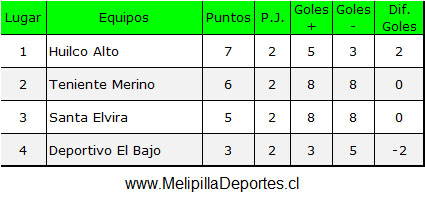 Con estos resultados, Huilco Alto lidera con 7 puntos, seguido de Teniente Merino con 6, Santa Elvira con 5 y Deportivo El Bajo con 3 unidades.