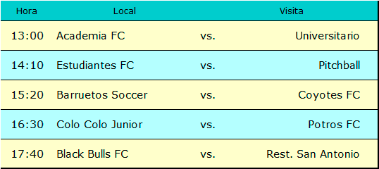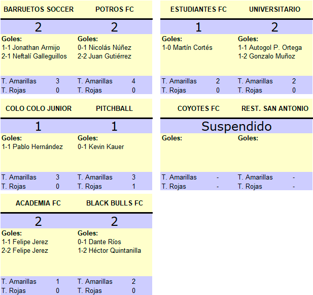 La tarde deportiva arrancó con el duelo entre Barruetos Soccer y Potros FC, estos últimos lograron la apertura de la cuenta por intermedio de Nicolás Núñez pero el team de plaza de armas reaccionó con las conquistas de Jonathan Armijo y Nefatalí Galleguillos para dar vuelta el marcador, finalmente Juan Gutiérrez sentenció el empate definitivo a dos goles.