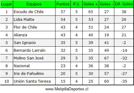 <div class="alert alert-warning"><strong>Resultados 5ª fecha</strong></div> <img class="alignnone wp-image-58098 size-full" src="https://www.melipilladeportes.cl/3.0/wp-content/uploads/2025/10/am25123.jpg" alt="" width="569" height="460" data-pin-no-hover="true" /> <div class="alert alert-warning"><strong>Tabla de posiciones</strong></div> <img class="alignnone wp-image-58099 size-full" src="https://www.melipilladeportes.cl/3.0/wp-content/uploads/2025/10/am25124.jpg" alt="" width="449" height="313" data-pin-no-hover="true" /> <div class="alert alert-warning"><strong>Programación 6ª fecha, domingo 12 de octubre de 2025</strong></div> <img class="alignnone wp-image-58100 size-full" src="https://www.melipilladeportes.cl/3.0/wp-content/uploads/2025/10/am25125.jpg" alt="" width="606" height="277" data-pin-no-hover="true" />