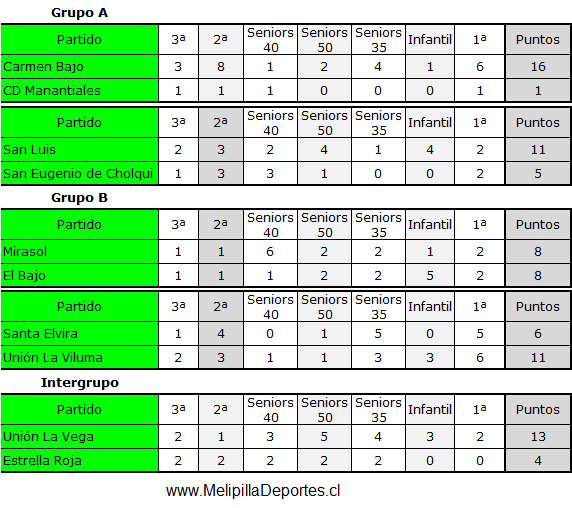 <div class="alert alert-warning"><strong>Resultados 5ª Fecha</strong></div> <img class="alignnone wp-image-59639 size-full" src="https://www.melipilladeportes.cl/3.0/wp-content/uploads/2026/02/vc26019.jpg" alt="" width="572" height="508" data-pin-no-hover="true" /> <div class="alert alert-warning"><strong>Tablas de posiciones</strong></div> <img class="alignnone size-full wp-image-59640" src="https://www.melipilladeportes.cl/3.0/wp-content/uploads/2026/02/vc26020.jpg" alt="" width="409" height="415" /> <div class="alert alert-warning"><strong>Programación 6ª fecha, domingo 22 de febrero de 2026</strong></div> <img class="alignnone wp-image-59641 size-full" src="https://www.melipilladeportes.cl/3.0/wp-content/uploads/2026/02/vc26021.jpg" alt="" width="569" height="375" data-pin-no-hover="true" />