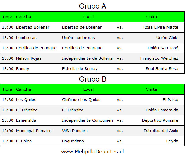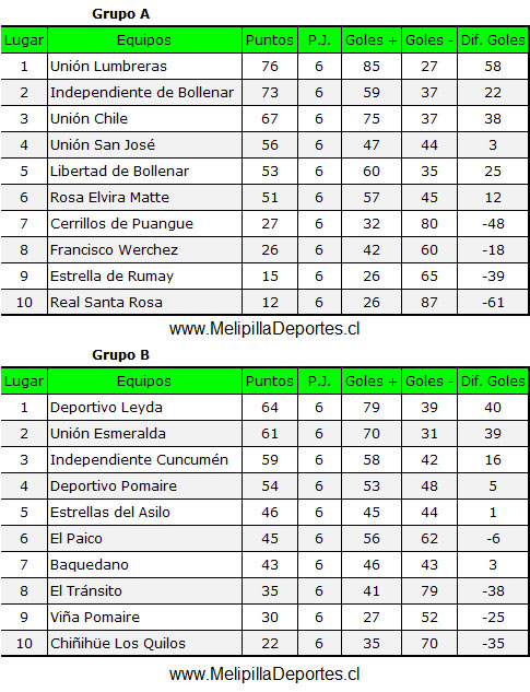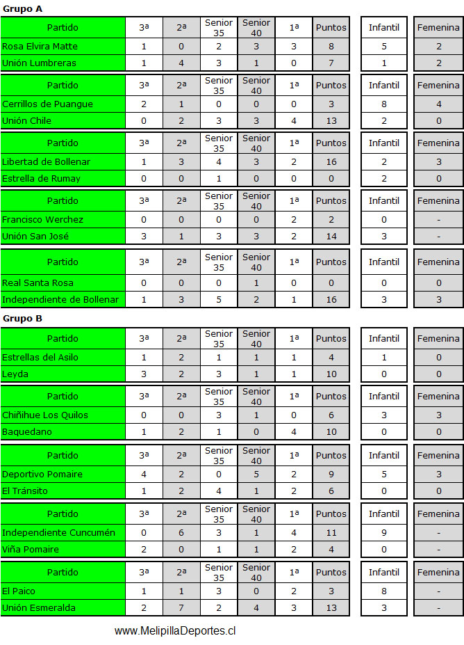 <div class="alert alert-warning"><strong>Resultados 6ª fecha</strong></div> <img class="alignnone wp-image-58290 size-full" src="https://www.melipilladeportes.cl/3.0/wp-content/uploads/2025/10/sj25128.jpg" alt="" width="668" height="927" data-pin-no-hover="true" /> <div class="alert alert-warning"><strong>Tablas de posiciones</strong></div> <img class="alignnone wp-image-58291 size-full" src="https://www.melipilladeportes.cl/3.0/wp-content/uploads/2025/10/sj25129.jpg" alt="" width="485" height="633" data-pin-no-hover="true" /> <div class="alert alert-warning"><strong>Programación 7ª fecha, domingo 26 de octubre de 2025</strong></div> <img class="alignnone wp-image-58292 size-full" src="https://www.melipilladeportes.cl/3.0/wp-content/uploads/2025/10/sj25130.jpg" alt="" width="608" height="516" data-pin-no-hover="true" />