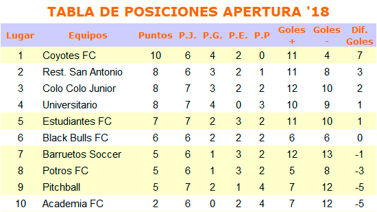 En el duelo de fondo se midieron los extremos, el puntero Coyotes FC y el colista Academia FC, pero esa diferencia no se notó en el campo de juego donde los académicos lograron la ventaja por intermedio de Gonzalo Valdenegro, de ahí llegó la reacción de Coyotes que lo dieron vuelta con las conquistas de Alexis Maldonado e Ignacio Silva, finalmente Héctor Gómez selló el definitivo empate a dos goles.