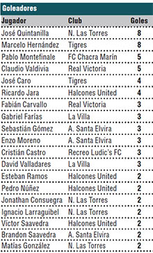 De semifondo correspondió el choque entre Tigres y Real Victoria donde estaba en juego para Tigres amagar la chance de Halcones de ser el único líder. Y comenzó bien el elenco felino ya que se puso arriba por intermedio de Marcelo Hernández (N. de la R.: agradecemos la aclaración que no es “Bam Bam” sino que es su hermano). Pero los rosas de Mauricio González no se desesperaron y consiguieron el empate mediante un gol de Claudio “Poroto” Valdivia. Pocos minutos después Real Victoria dio vuelta el marcador con una conquista de Fabián Carvallo, resultado con el que concluyó el primer tiempo. Con la reanudación de las acciones Tigres se fue con todo buscando emparejar las cifras y lo consiguió luego que Héctor Hernández anotara mediante un lanzamiento penal tras una clara falta de Rubén Espinoza sobre Gabriel Espinoza. Con el empate a dos goles ambos equipos tuvieron oportunidades de desnivelar pero la cuenta no se movería más sellando una justa igualdad por lo visto en cancha.