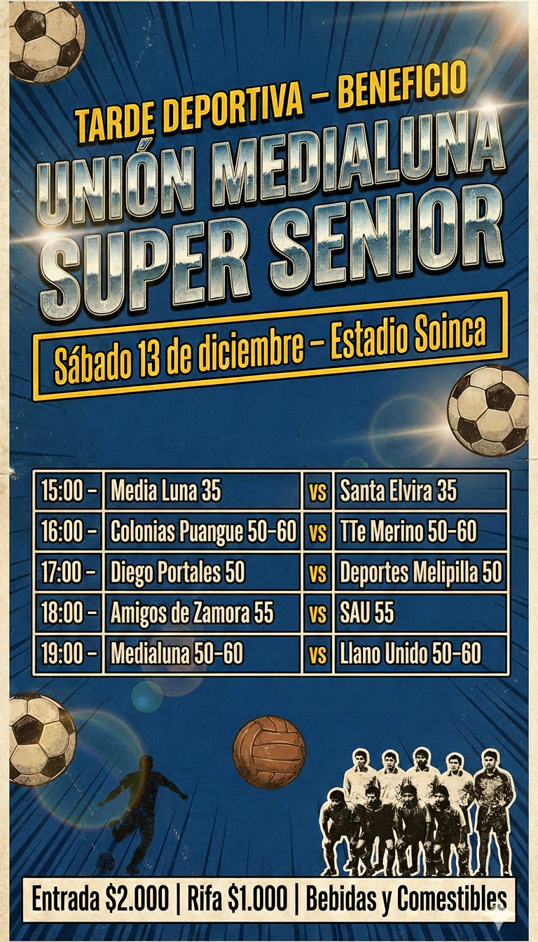 Una completa jornada futbolística se realizará este sábado 13 de diciembre en el estadio Soinca, donde se llevará a cabo una tarde deportiva en beneficio de Unión Medialuna Super Senior, instancia que busca recaudar recursos para las actividades del club.