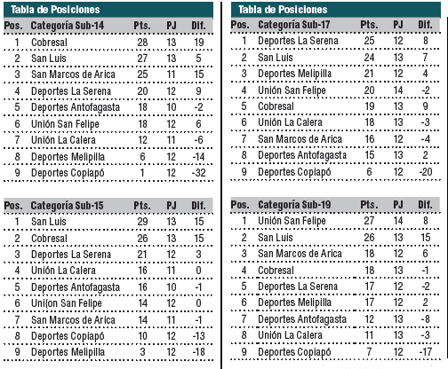 La tabla de posiciones sufrió importantes variaciones respecto a las categorías Sub-17 y Sub-19 que son las que están encumbradas en la parte superior de las clasificaciones gracias al excelente trabajo realizado por Víctor Quintanilla, Alexis Jiménez, Christian Traverso y Maximiliano Santibáñez ya que los “Potrillos’” bajaron una par de puestos, aunque tienen un partido menos que quienes los anteceden.