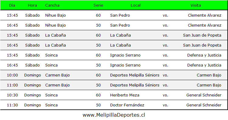 <div class="alert alert-warning"><strong>Programación 2ª fecha, sábado 11 y domingo 12 de abril de 2026</strong></div> <img class="alignnone wp-image-60253 size-full" src="https://www.melipilladeportes.cl/3.0/wp-content/uploads/2026/04/ud26006.jpg" alt="" width="751" height="397" data-pin-no-hover="true" />
