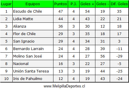 <div class="alert alert-warning"><strong>Resultados partido pendiente</strong></div> <img class="alignnone wp-image-57930 size-full" src="https://www.melipilladeportes.cl/3.0/wp-content/uploads/2025/10/am25119.jpg" alt="" width="569" height="127" data-pin-no-hover="true" /> <div class="alert alert-warning"><strong>Tabla de posiciones</strong></div> <img class="alignnone wp-image-57931 size-full" src="https://www.melipilladeportes.cl/3.0/wp-content/uploads/2025/10/am25120.jpg" alt="" width="449" height="313" data-pin-no-hover="true" /> <div class="alert alert-warning"><strong>Programación 5ª fecha, domingo 5 de octubre de 2025 desde las 12 horas</strong></div> <img class="alignnone wp-image-57932 size-full" src="https://www.melipilladeportes.cl/3.0/wp-content/uploads/2025/10/am25121.jpg" alt="" width="606" height="277" data-pin-no-hover="true" />
