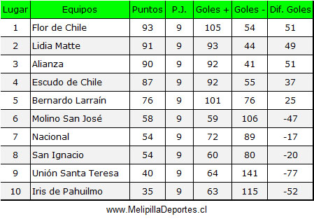 <div class="alert alert-warning"><strong>Resultados 9ª fecha</strong></div> <img class="alignnone wp-image-58641 size-full" src="https://www.melipilladeportes.cl/3.0/wp-content/uploads/2025/11/am25143.jpg" alt="" width="569" height="460" data-pin-no-hover="true" /> <div class="alert alert-warning"><strong>Tabla de posiciones</strong></div> <img class="alignnone wp-image-58642 size-full" src="https://www.melipilladeportes.cl/3.0/wp-content/uploads/2025/11/am25144.jpg" alt="" width="449" height="313" data-pin-no-hover="true" /> <div class="alert alert-warning"><strong>Programación Finales por Series, domingo 23 de noviembre de 2025</strong></div> <img class="alignnone wp-image-58643 size-full" src="https://www.melipilladeportes.cl/3.0/wp-content/uploads/2025/11/am25145.jpg" alt="" width="535" height="361" data-pin-no-hover="true" />